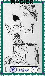 Der Magier steht vor einem Tisch, auf dem verschiedene Gegenstände willkürlich liegen, darunter Messer, die Mühsale und Schwierigkeiten symbolisieren, Münzen, die Vollendung und Verwirklichung kreativen Bemühens bedeuten, und Kelche, die auf Leidenschaften oder Glück hinweisen. Seine Linke nimmt Kraft von oben auf, und mit seinem festen Willen und seiner Kreativität schafft er Realität durch seine nach unten zeigende Rechte. Dieses duale Zeichen gibt zu verstehen, daß alles von oben kommt, um alles auf Erden zu schaffen. Der Magier erlebt durch seine eigene Kreativität und seine Fähigkeiten die Grundlagen seiner eigenen Identität. Er besitzt die Fähigkeit, die verschiedenen Gegenstände auf dem Tisch vor ihm so zu nützen, dass er in Gedanken, Wort und Handlung erfolgreich ist. Der Magier nimmt das Leben wahr als ein unaufhörliches Glücksspiel, das Umstände bietet, die ganz nach den individuellen Fähigkeiten wirklich kontrollierbar werden können. Sein grosses Mass an Wissen verschafft ihm zudem das notwendige Selbstbewusstsein und die notwendige Kraft zur Durchsetzung seiner Ziele...und deiner?.